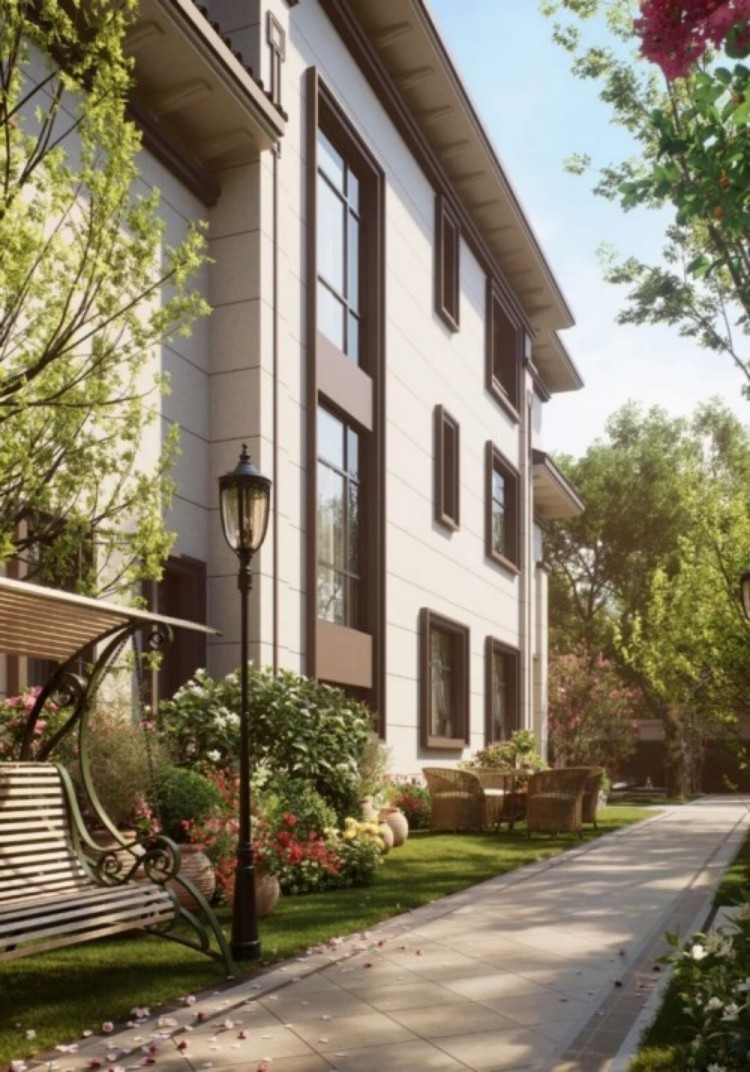 建筑立面以米白色为主调,质感细腻,干净雅致。檐口、窗框、立柱等处皆以深棕色线条勾勒,如中 国画中的“勾边”,清晰塑造立面层次。